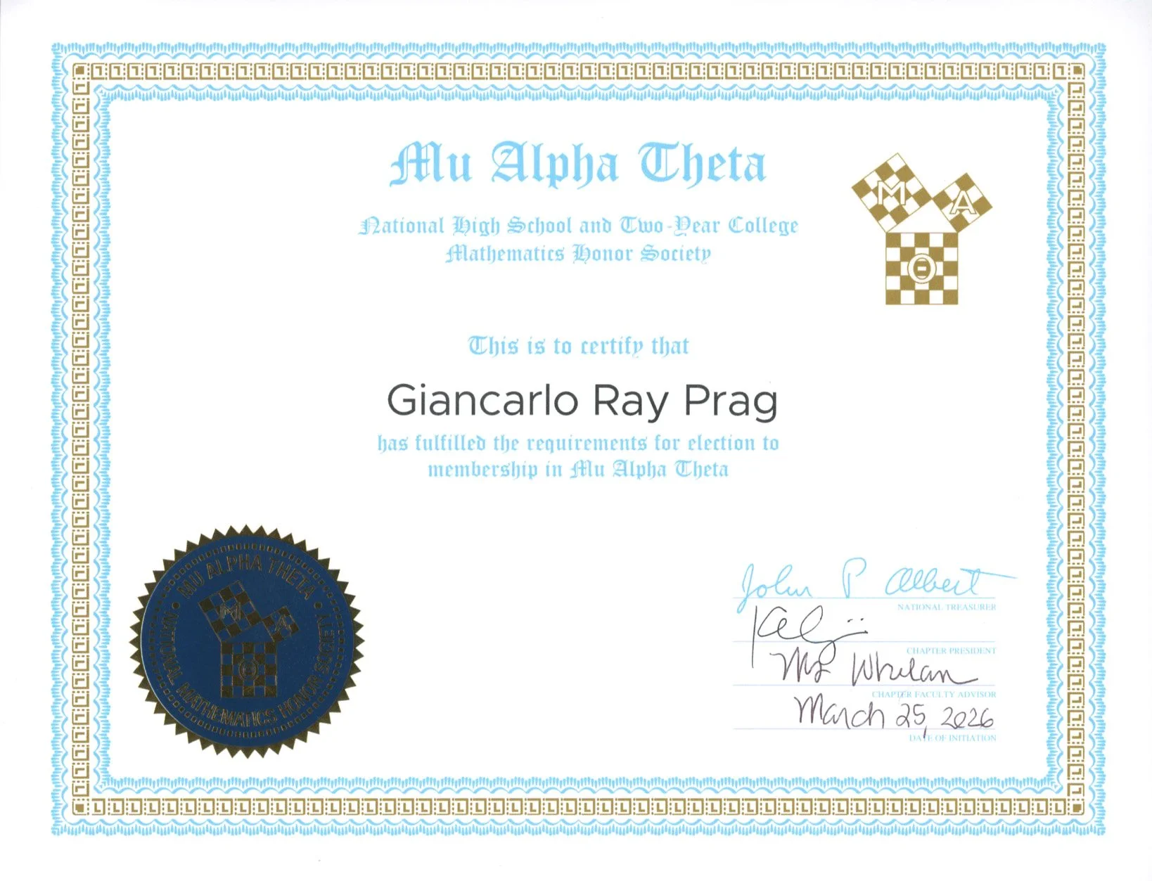 and Two Year College Mathematics Honor Society.